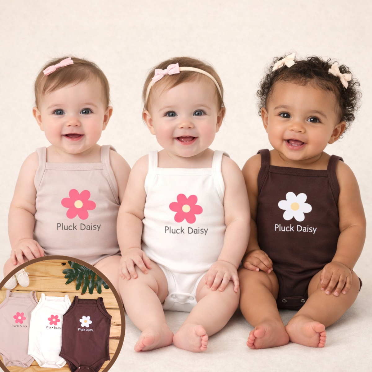 Estampa: flor + escrito “Pluck Daisy” (padrão em todas as peças)
