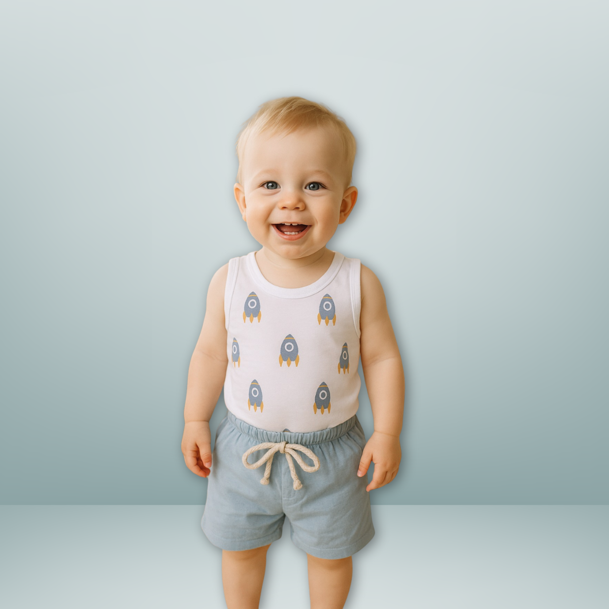 Body Bebê Menino Infantil Regata Sem Manga + Short em Linho – Estampa DTF Leve e Macia 👶💙 | Conjunto 100% Algodão